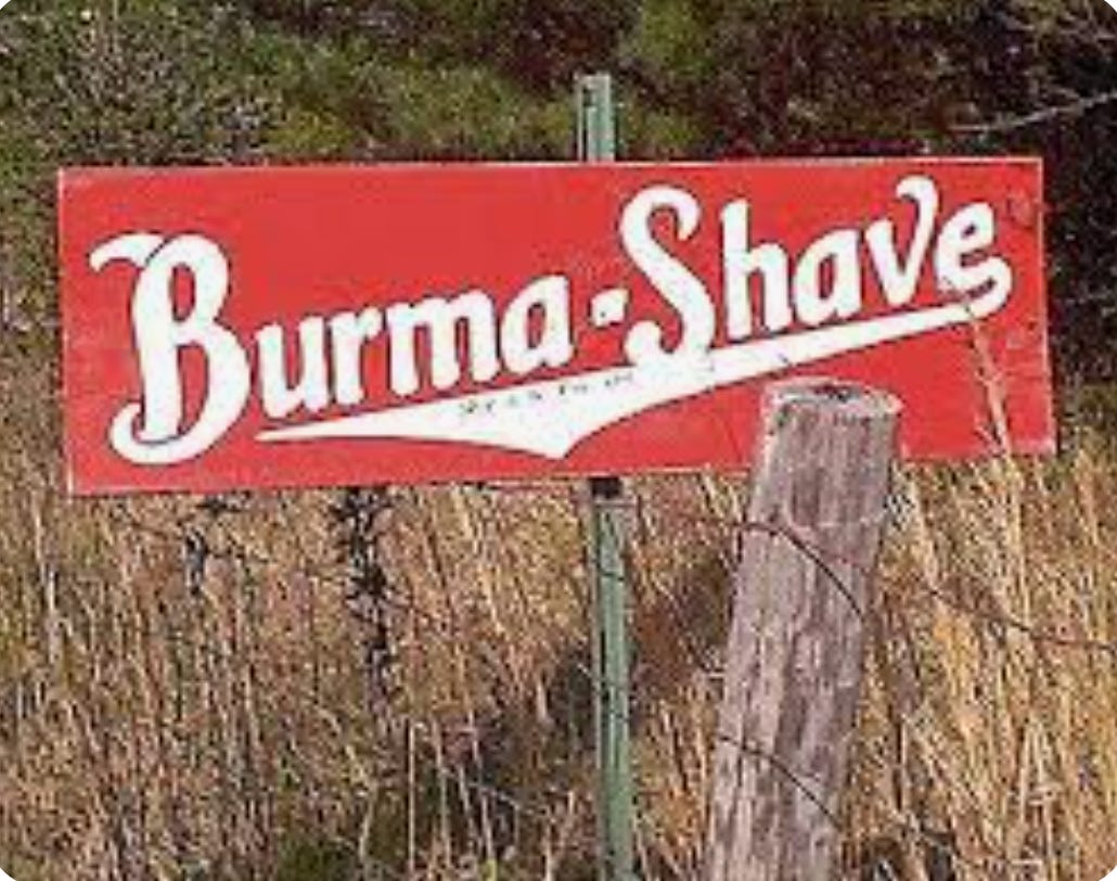 I have always believed in the power of Burma Shave marketing techniques. I even used them in a political campaign.